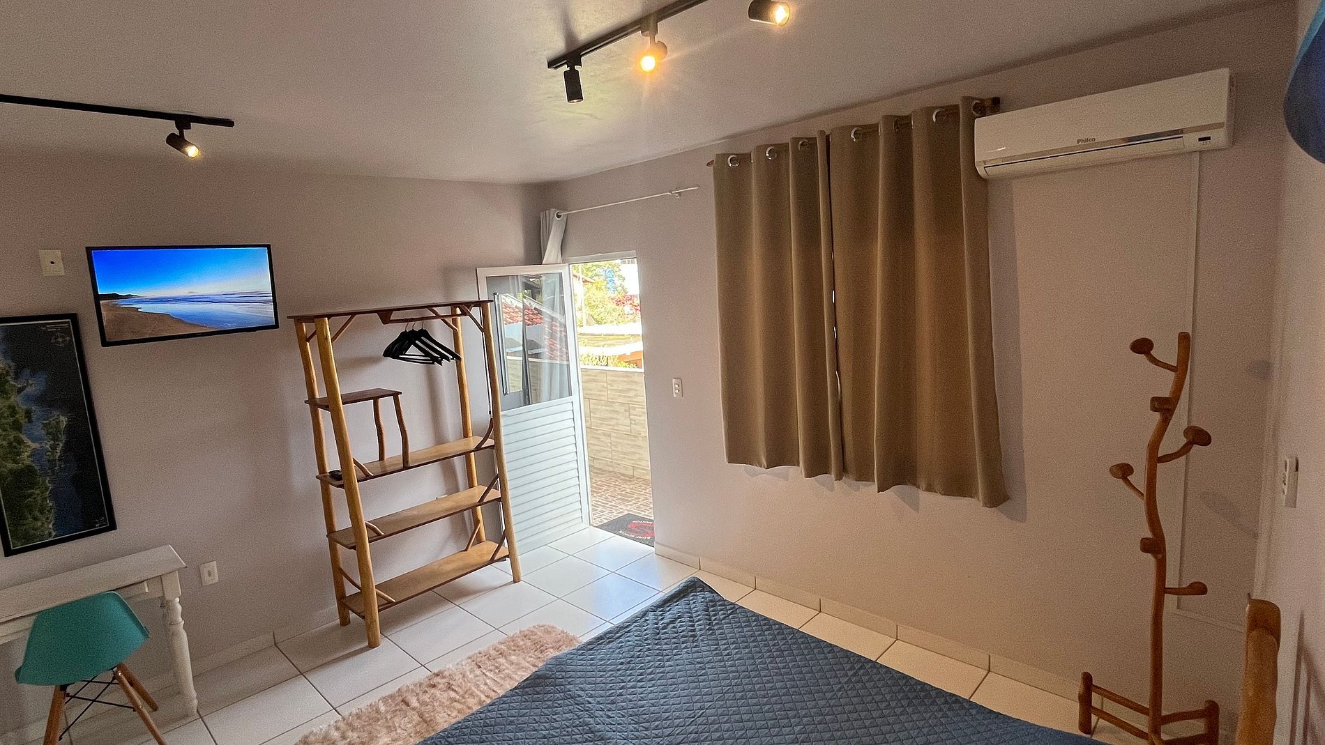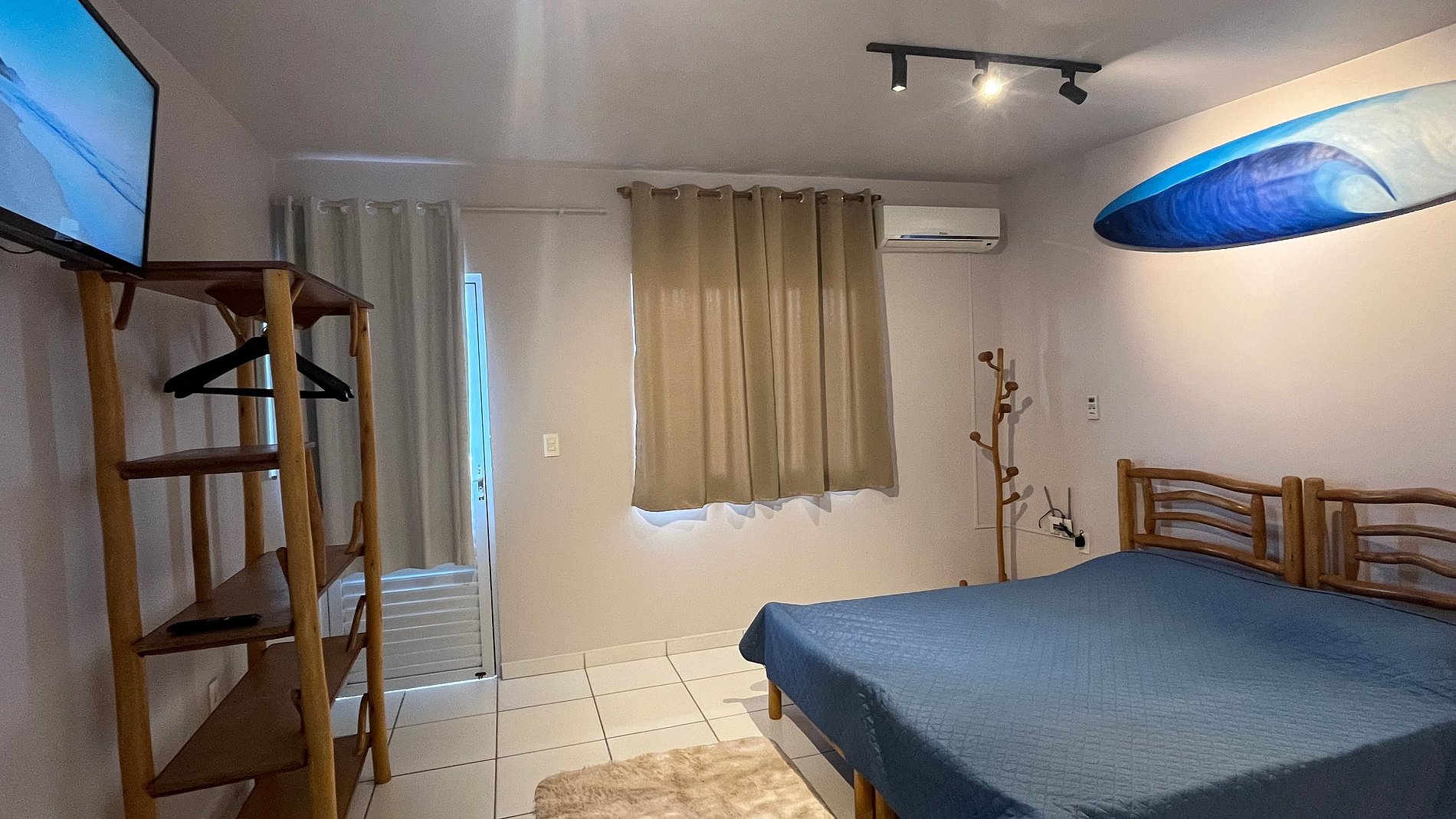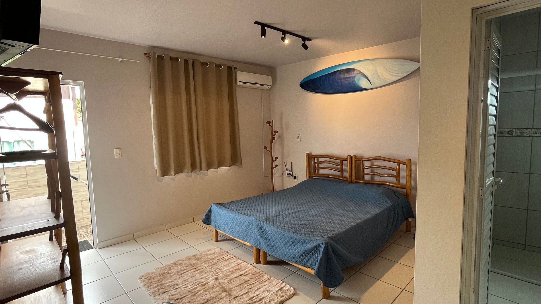 O studio conta com cama de casal (ou duas de solteiro), banheiro, geladeira, pia, mesa para refeições ou home office, ar-condicionado, roteador wi-fi exclusivo e smart tv. No andar de baixo, você encontra o espaço da nossa Escola de Surf, com diversas pranchas de surf, pranchas de treinamento, de equilíbrio e inclinação, espaço para a aula teórica em vídeo, além da cozinha coletiva completa e uma mini ramp particular para quem sabe e gosta de skate - tudo em um ambiente familiar, silencioso, acordando com os passarinhos e a poucos minutos da famosa Praia da Barra da Lagoa.